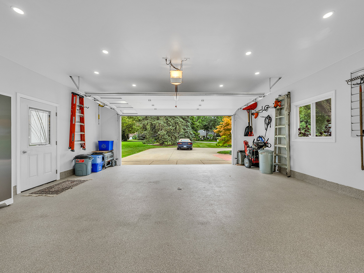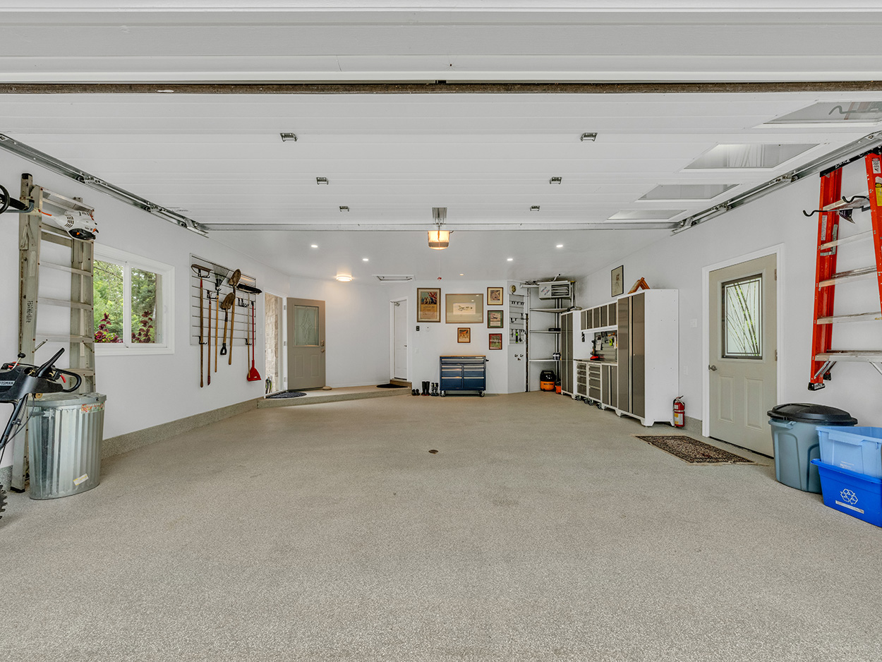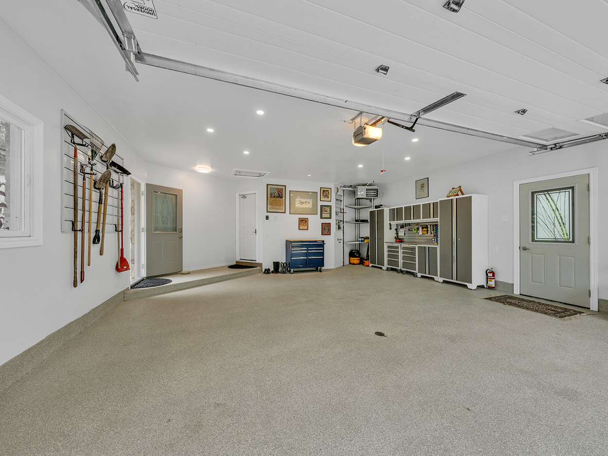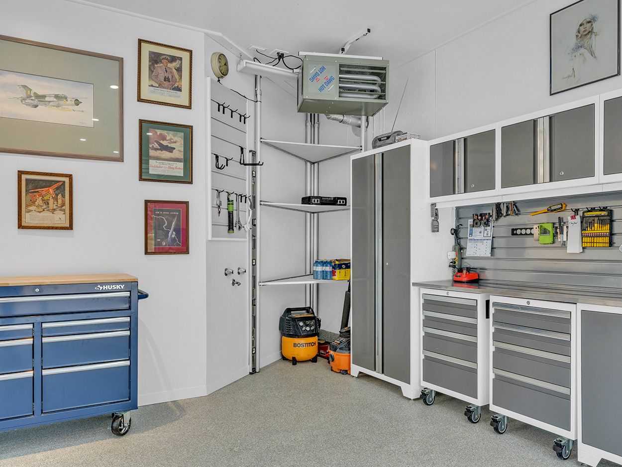 Below are pictures of the heated double garage, complete with New Age garage storage units, stainless steel counter, slat wall, and a LED trouble light. Click on an image to see the larger picture.